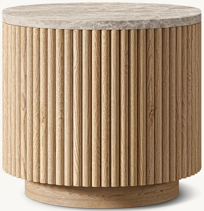 столешнику из мрамора, чей отличительный вининг и прохладная текстура источают изысканность и роскошь. Шкаф, с другой стороны, изготовлен из светлого дерева, с прозрачными деревянными зернами, которые излучают естественную и деревенскую атмосферу. Прохлада мрамора контрастирует с теплом древесины, создавая поразительный, но гармоничный баланс между материалами и текстурами, тем самым поднимая общую эстетику бокового стола.