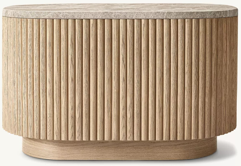 конструкцию вертикальной полосы на поверхности шкафа - очень гениальная деталь. Эти вертикальные полосы не только добавляют трех - размерный эффект к боковой таблице, но и наделяют его динамическим ощущением ритма. Когда свет сияет на боковом столе, вертикальные полосы создадут светлый - и - теневой эффект чередующейся яркости и темноты, что делает боковой стол выглядеть более ярким и интересным. Более того, направление расположения вертикальных полос повторяет овальный контур бокового стола, что еще больше усиливает общую гармоничную красоту.