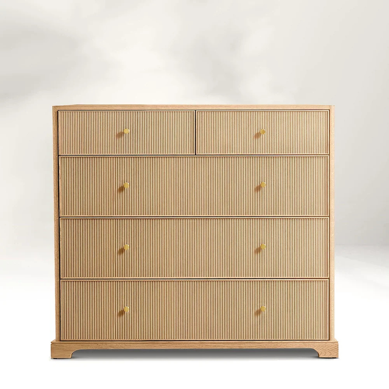 Шкаф использует североамериканский белый дуб (или эквивалентный высококачественный светлый дерево). Древесина тщательно отбирается с возрастом дерева ≥30 лет, показывает последовательное зерно и несколько узлов. Процесс ручной фрезерной фрезерования обеспечивает глубину канавки (равномерное 1,5 мм) и расстояние (точный 3 мм) с точностью 0,1 мм. Каждая вертикальная канавка является прямой и параллельной, создавая регулярные тени под светом, чтобы улучшить тактильный и визуальный порядок.