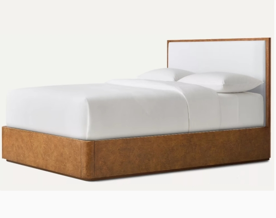 Изголовье обитано в гладкой белой ткани, обеспечивая чистый и современный контраст с текстурированной основой. Это просто, но элегантно, предлагая удобный фон для поддержки подушек. Кровать одета в четкое белое постельное белье, улучшая чувство чистоты и расслабления. Эта комбинация отличительной основы Burl - эффекта и минималистского белого изголовья и постельного белья приводит к кровати, которая является как заявлением, так и убежищем для отдыха, смешивая современный дизайн с естественным очарованием.