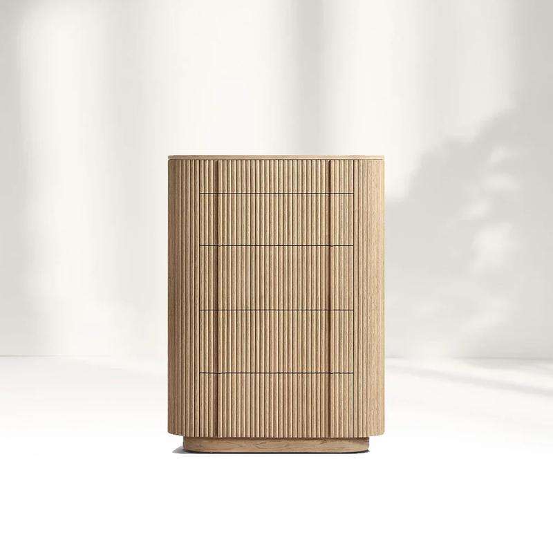 Этот шкаф является ярким примером современного минималистского дизайна. Созданный из светлого дерева, он имеет вертикальную ребристую текстуру, которая добавляет глубину и визуальный интерес, не жертвуя простотой. Округлые края смягчают его общий вид, создавая гладкий и привлекательный вид.