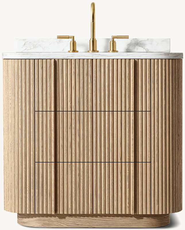 Настройка столешницы богата: 1 -дюймовый твердый мрамор, травертин или кварцевый столешница и водопроводной дефлектор, продлевая ¼ -развлечения на обеих сторонах столешницы за пределами водоснабжения. При необходимости выбранные отверстия для столешницы могут быть выбраны (1 отверстие / 3 отверстия / без отверстий) и совместимы с различными смесями для ванной комнаты (приобретаются отдельно).
